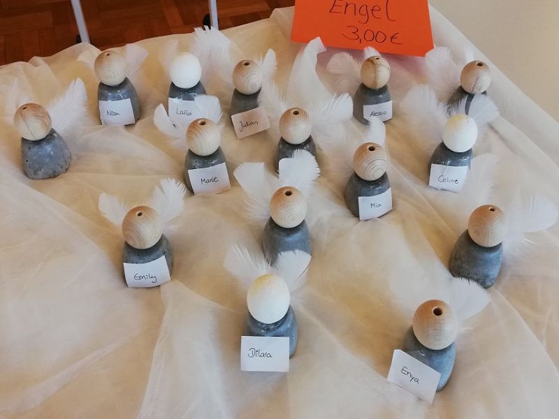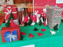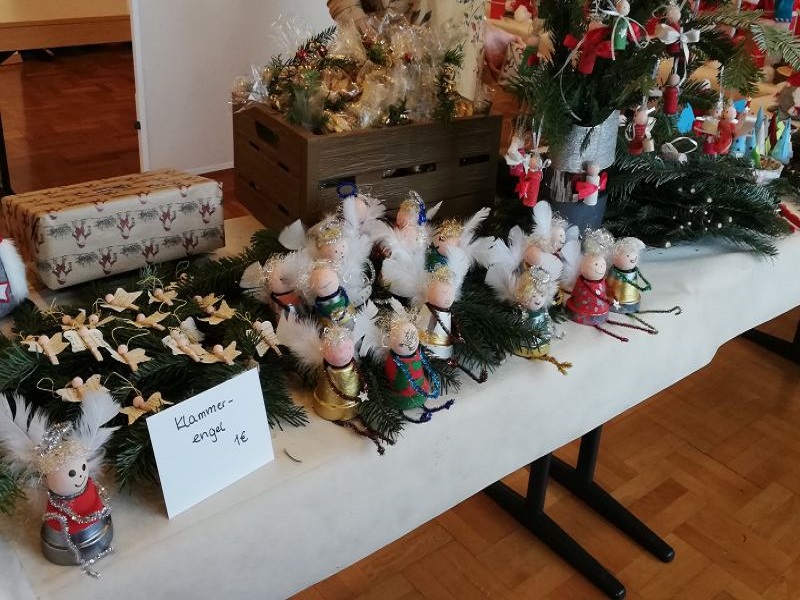 Es gab Schlüsselanhänger aus Fimo, wunderschön bedruckte Stofftaschen, Schnee- und Weihnachtsmänner aus Holz, Papier und Kronkorken, Engel aus verschiedensten Materialien, beklebte Windlichter, Adventsspiralen, gefaltete Sterne, verschiedene Weihnachtskarten, Tannenbäume aus Wolle und Filz, Schalen aus Pappmaschee, leckere Plätzchen und Backmischungen, sowie verschiedene Anhänger für den Weihnachtsbaum.
