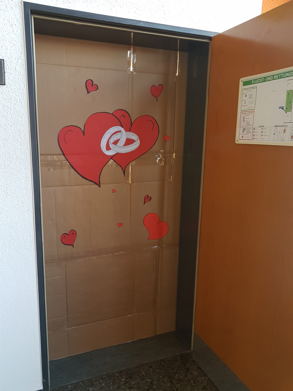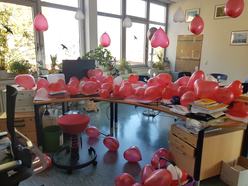 Groß war die Überraschung als die gesamte Schulgemeinde ihrer Rektorin Frau Schäfer – jetzt Frau Sartorius zur Hochzeit gratulierte. Schon der Weg ins Rektorat war für sie beschwerlich und innen hing der Himmel voller Geigen – nein voller Herzballons.
