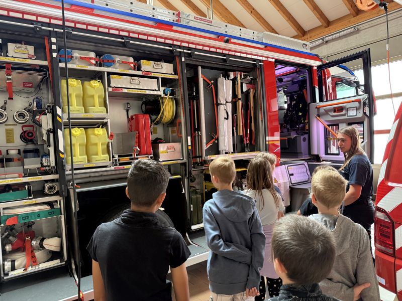 Die Klasse 4 war am Freitag, den 25.07.25 bei der Feuerwehr Ötisheim. Zuerst wurden wir in vier Gruppen eingeteilt. Abwechselnd durften wir an Stationen mit dem Hohlstrahlrohr Wasser wie beim Löschen eines Feuers spritzen. In einer weiteren Station lernten wir in der Fahrzeugkunde viele interessante Geräte der Ausrüstung eines Feuerwehrautos kennen. In das Auto durften wir auch hineinsitzen und durch ein Wärmebildgerät schauen. Bei der dritten Station durften wir eine kleine Runde mit dem Feuerwehrauto mitfahren. Die vierte Station fand in den Umkleideräumen der Feuerwehr statt. Dort konnten wir auch Feuerwehr-Einsatzkleidung anprobieren. Die Jacken waren sehr schwer. Wir hatten viel Spaß und es war ein schöner Tag bei der Feuerwehr Ötisheim. Zum Schluss haben wir noch ein Bild vor dem Feuerwehrauto gemacht.