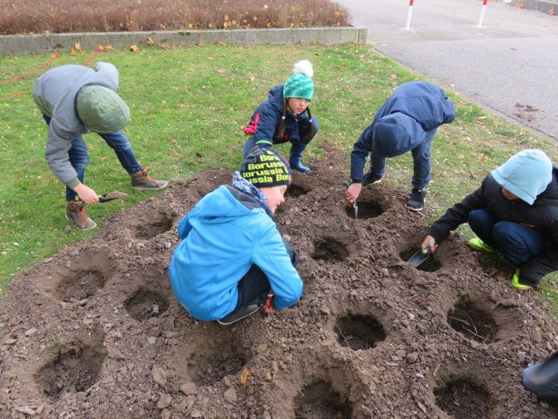 Wir holten die Erde und Steine aus den Löchern. Danach setzten wir die Zwiebeln ein und bedeckten sie mit der ausgegrabenen Erde. Wir sind gespannt, welche Blumen im Frühling blühen!