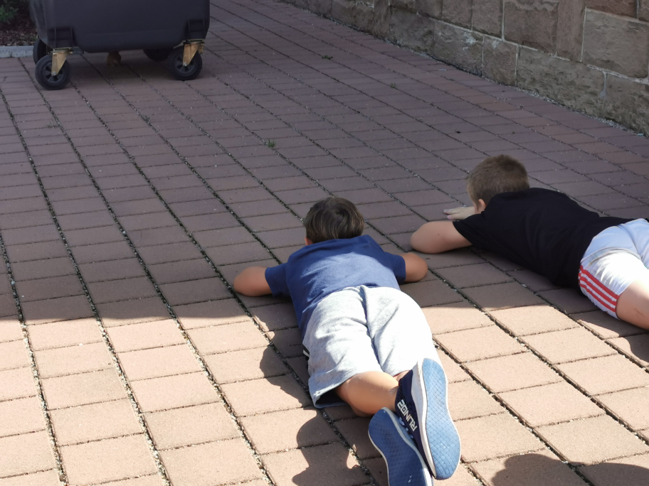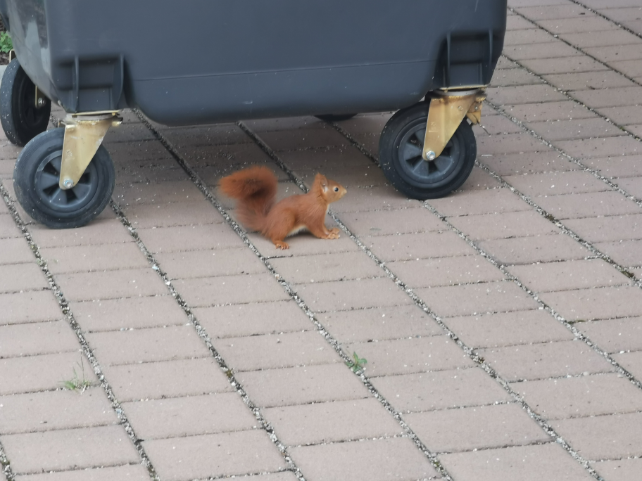 Am Freitag, 02.07.21 entdeckten die Kinder der Klasse 3b während der Hofpause ein junges Eichhörnchen auf dem Schulgelände. Es versteckte sich immer wieder unter den Mülltonnen. Die aufgeregte Eichhörnchenmutter versuchte es auf die große Linde hinauf zu locken. Gewandt balancierte die flinke Mutter über das Hoftor und animierte ihr Kind durch Nasenstupser zum Mitkommen. Allerdings blieb das Jungtier sitzen und hüpfte auch immer mal neugierig auf die jungen Beobachter zu. Manche Schüler beobachteten die ganze Pause über das Jungtier und lauschten den spitzen Rufen des Muttertiers aus der Linde.