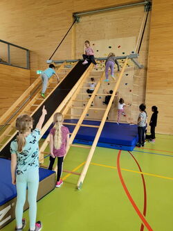 Fast jeden Tag trifft die Klasse 1a die Vorschulkinder im Gang oder auch auf dem roten Platz bei einer Bewegungspause. Da lag es nahe, auch einmal eine gemeinsame Sportstunde durchzuführen. Nach dem gemeinsamen Umziehen trafen sich alle bei einem Klatschrhythmus im Kreis. Die ErzieherInnen hatten sich ein sportliches Lied überlegt, um auf die Bewegung einzustimmen. Dann ging es an den Aufbau. Stolz bewiesen die Erstklässler, wie gut sie schon die Geräte transportieren und aufbauen können. Unter ihrer Anleitung packten die Vorschulkinder tatkräftig mit an und so entstand schnell ein abwechslungsreicher Bewegungsparcours zum Klettern, Rutschen, Krabbeln, Schaukeln und Balancieren. Wieder einmal zeigte die neue Sporthalle ihre Qualitäten, immerhin konnten sich über 40 Kinder so richtig austoben. Mit Begeisterung bewegten sich die Kinder, mit dem Zuspruch der Erstklässler gelang es auch fast jedem Vorschulkind die steile Rutsche herunter zu rutschen. Ganz selbstverständlich wurde die Hand gegeben und geholfen.