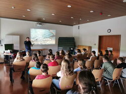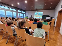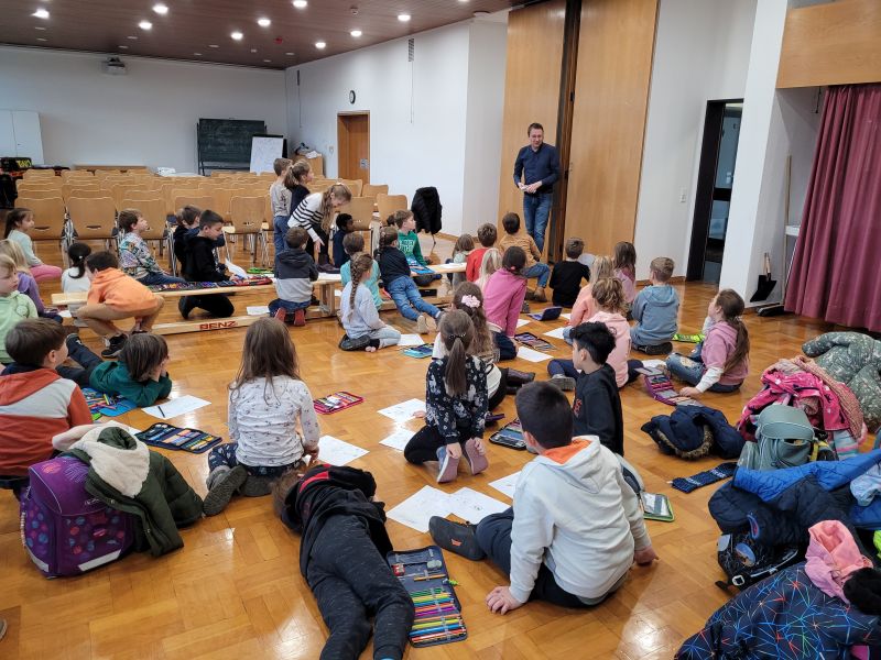 Auch seine Zeichenkünste stellte er unter Beweis. Nicht nur an der Flipchart, sondern auch auf Postkarten. Jedes Kind durfte eine Karte mit einer kleinen Zeichnung und einem Autogramm darauf mitnehmen.