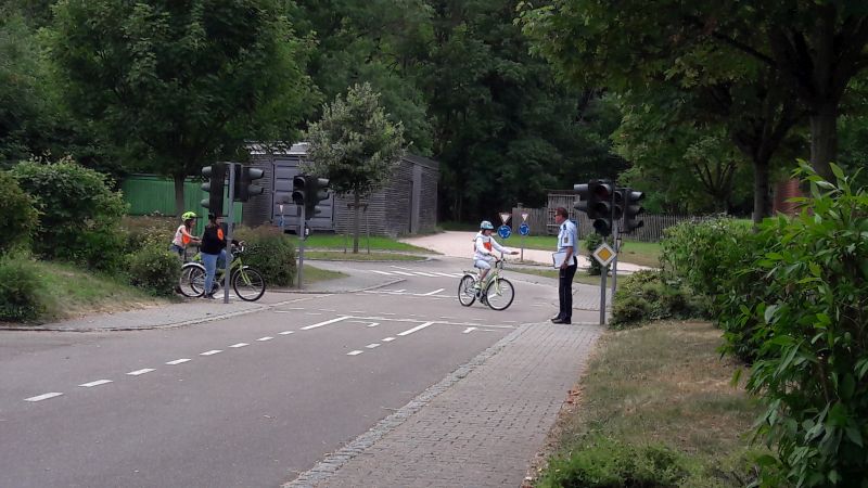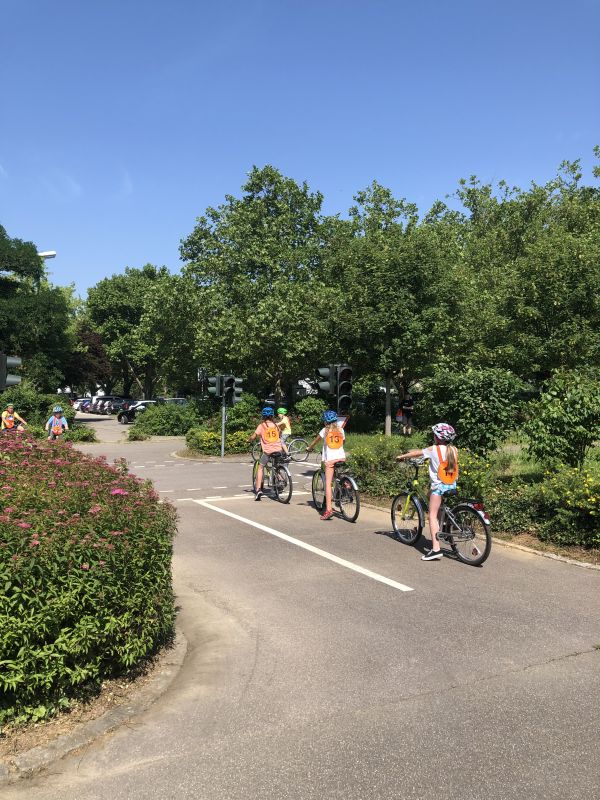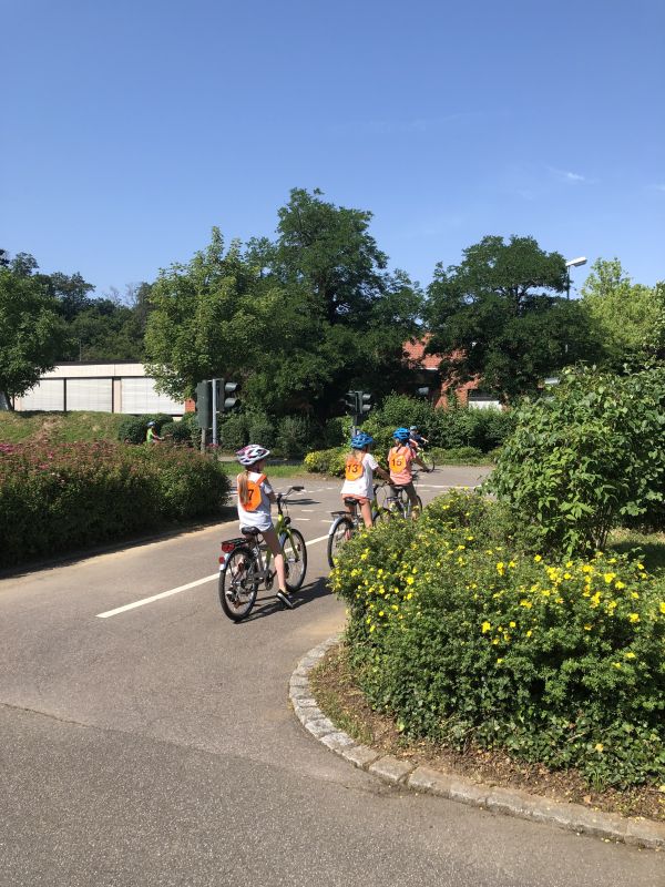 Die theoretischen Inhalte für die Fahrradausbildung wurden im Rahmen des Sachunterrichts in der Schule vermittelt. Die drei praktischen Einheiten und die Prüfung fanden in der Jugendverkehrsschule in Mühlacker statt. Die beiden Polizisten, Herr Bauer und Herr Weber, schulten die Kinder z.B. im Linksabbiegen und im Einhalten der Verkehrsregeln.