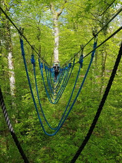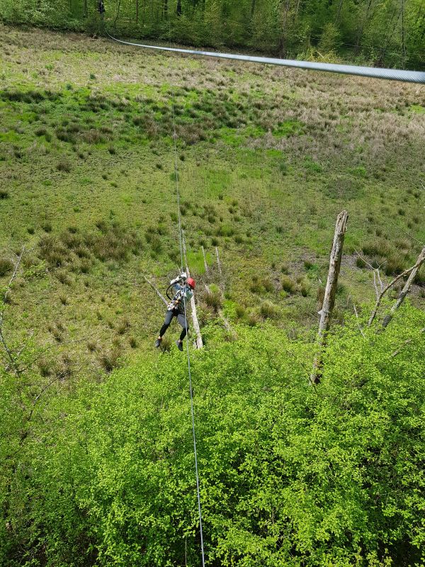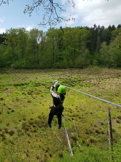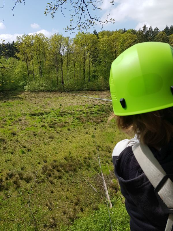 In kleinen Teams durften wir dann losziehen und klettern. Es gab mehrere Starterparcours mit nur einem Eichhörchen, das anzeigte, dass es ein einfacher Parcours war. Einen davon sollten wir zuerst klettern. Danach konnten wir auch die schweren mit zwei oder drei Eichhörnchen klettern. Es gab den Basejump bei dem man aus 12 Meter Höhe von einer Plattform herunterspringen kann. Einige von uns haben das auch gemacht. Es gab auch eine 500m lange Seilbahn über den Klostersee und einen Parcours den man zu zweit klettern konnte.