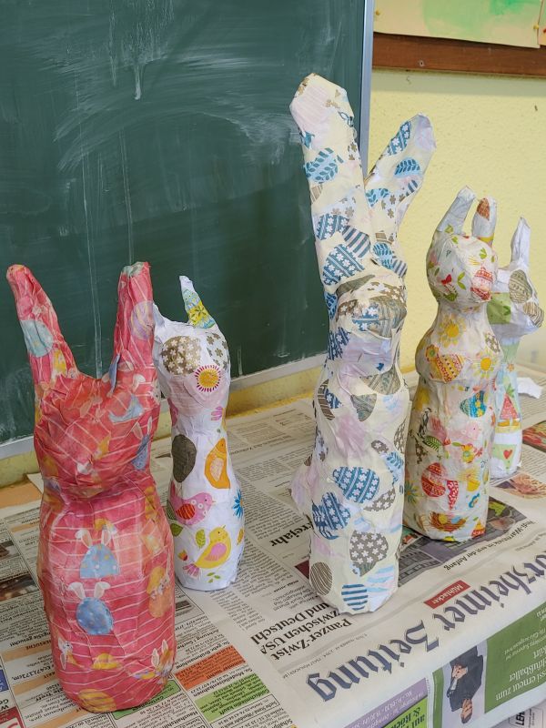 Aus sandgefüllten Kunststoffflaschen hat die Klasse 3b mit Hilfe von Zeitungspapier, sehr viel Kreppband, Kleister, weißem Papier und Geschenkpapier diese fantasievollen Osterhasen gefertigt.