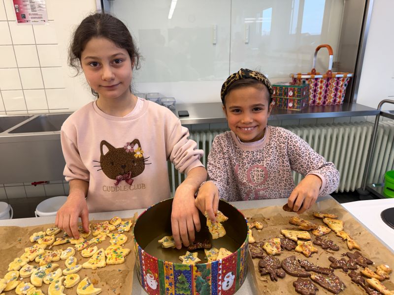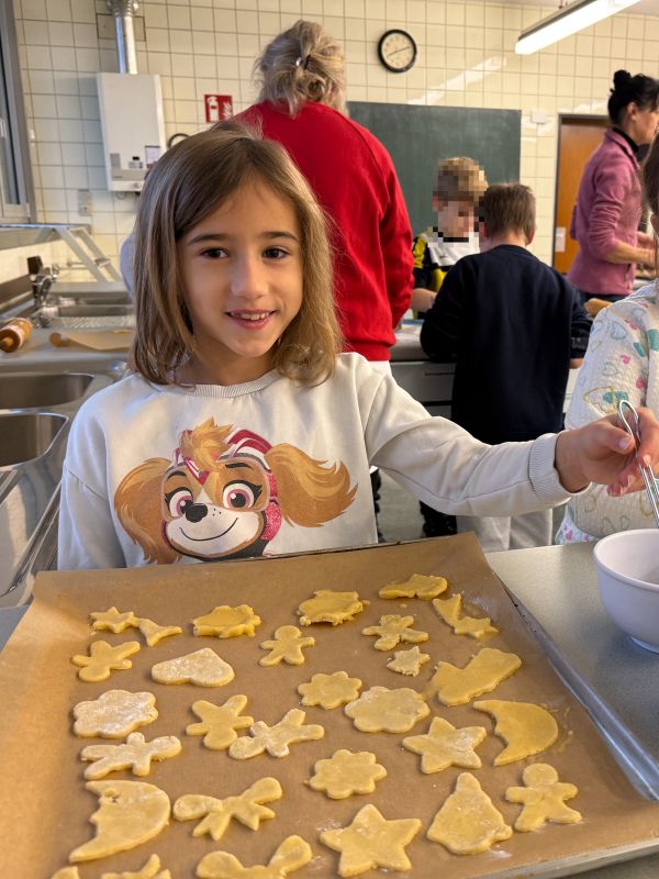 Noch vor dem ersten Advent haben die Klassen 2b und 2g am 27.11.2025 mit Unterstützung einiger Mütter begeistert viele leckere Plätzchen gebacken und schöne Sterne aus Transparentpapier gebastelt. In der Adventszeit dürfen die Kinder nun jeden Tag von ihren selbst gebackenen Plätzchen naschen. Die bunten Sterne schmücken die Fenster weihnachtlich. Herzlichen Dank an alle Eltern, die Teig und Zutaten gespendet haben sowie an die fleißigen Mütter, die in der Schule mitgeholfen haben.