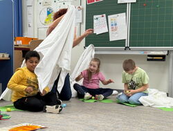 In der letzten Schulwoche waren die Klasse 1a und 1b der Henri-Arnaud-Grundschule bei ihrer Kooperationsklasse der Gustav-Heinemann-Schule zu einer kleinen Aufführung eingeladen. Durch einen Tunnel gelangten die Erstklässler ins Klassenzimmer der 1c. Die Kinder der Gustav-Heinemann-Schule führten die „Kleine Raupe Nimmersatt“ als kleines Singspiel auf. Nach dem Tanz der Schmetterlinge freuten sie sich über den verdienten Applaus.