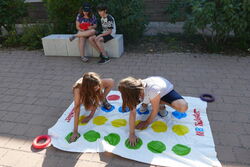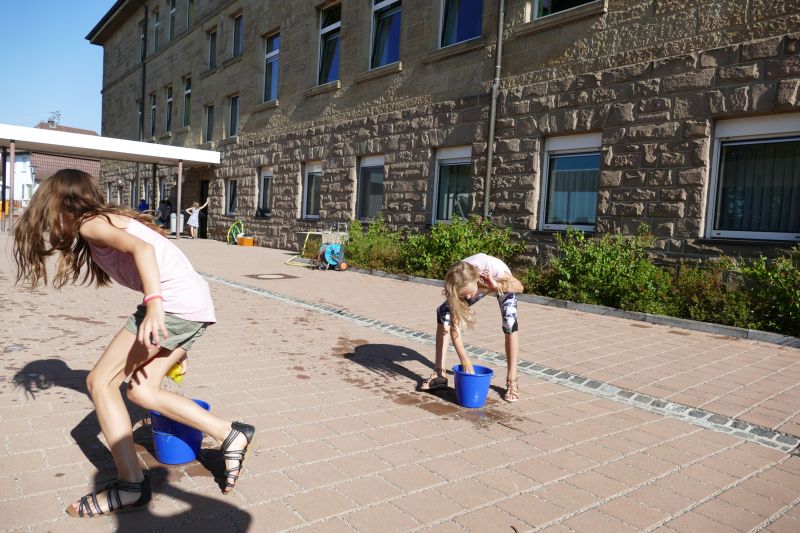 Die Erstklässler begannen in der Sporthalle mit dem Minigolf, die Zweitklässler durften als Erstes die Kühle des Schulhauses nutzen und sich dort mit den Brettspielen beschäftigen. Die Drittklässler starteten den Spieletag mit verschiedenen Pausenspielen auf dem Schulhof und die Viertklässler versuchten sich an den Geschicklichkeitsspielen auf dem roten Platz. Dort erhielten alle Schüler, wenn sie an der Station waren zur Erfrischung noch Wassermelone.