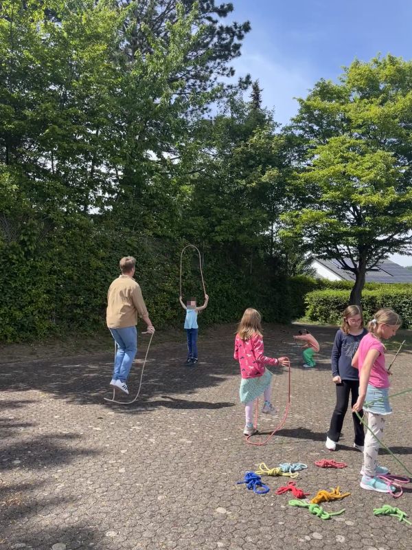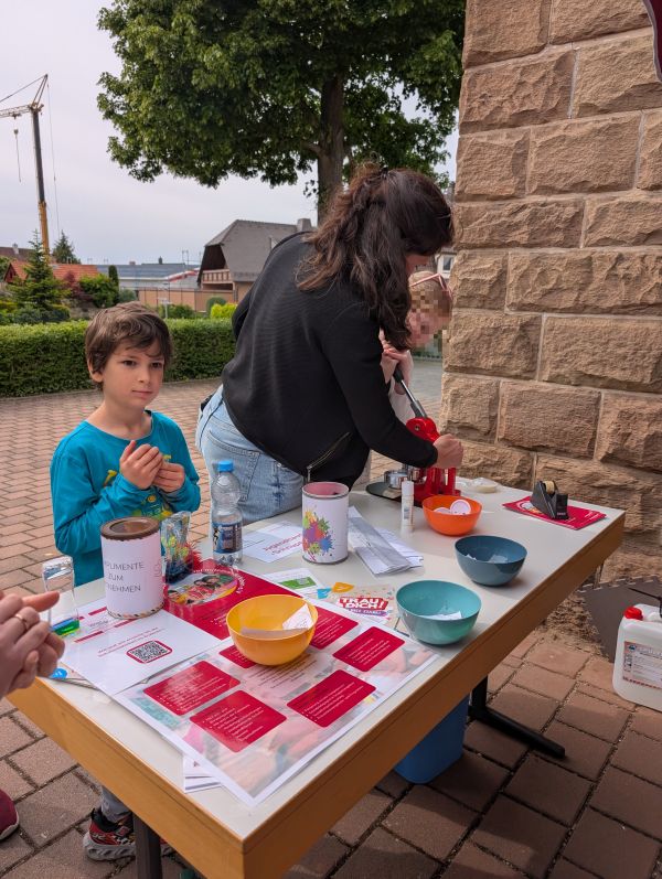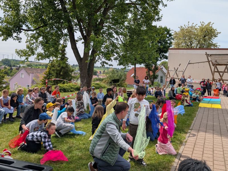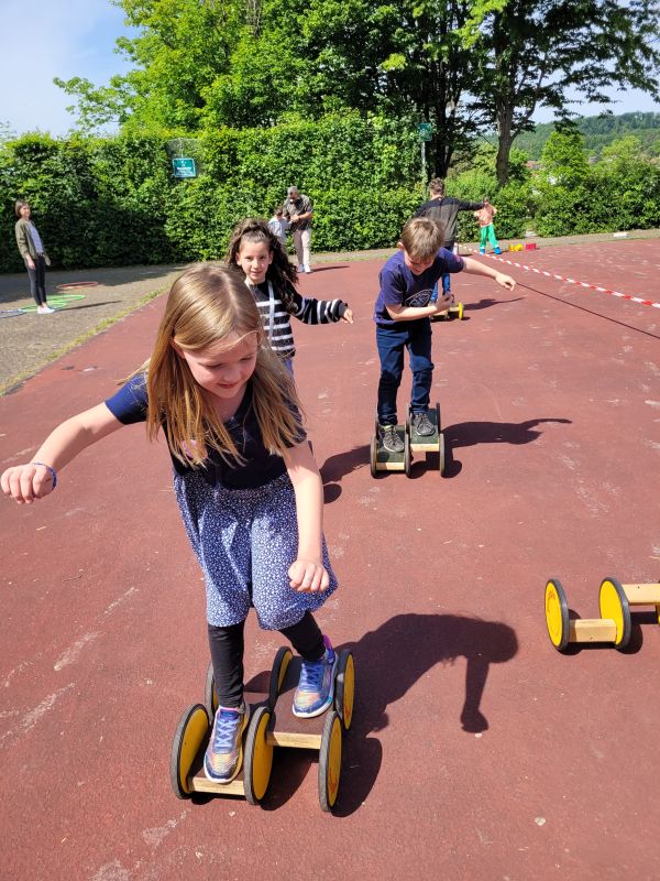 Auf dem Schulhof konnten sich im Anschluss an das Programm die Gäste mit den Schulsozialarbeiterinnen der beiden Schulen und der Offenen Jugendarbeit unterhalten. Außerdem gab es ein Glücksrad und eine Spielstraße auf dem roten Platz. Besonders begeistert waren die Kinder von der Aktion „Riesenseifenblasen“ des Elternbeirates.