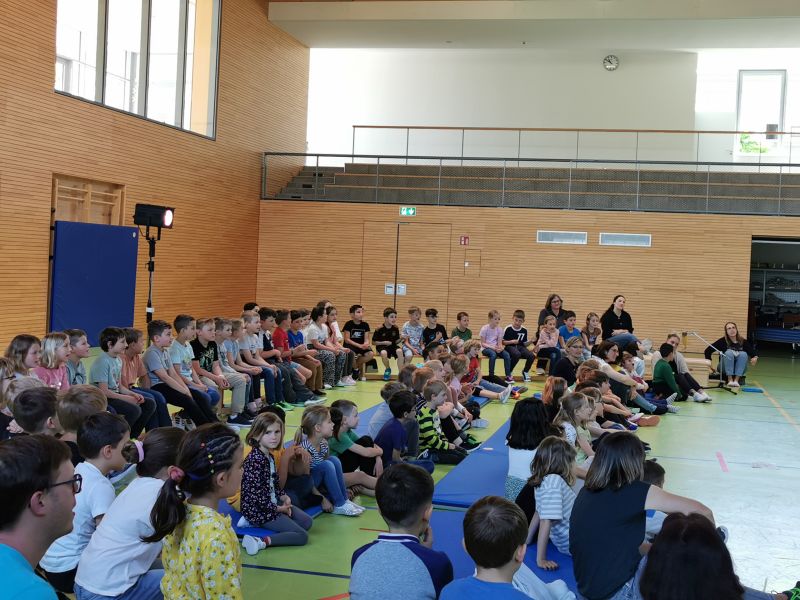 Am Donnerstag, 06.06.2024 wurden die Erst- und Zweitklässler der Henri-Arnaud-Grundschule und der Gustav-Heinemann-Schule von Frank Ströber dem Erzähler in der Sporthalle erwartet.