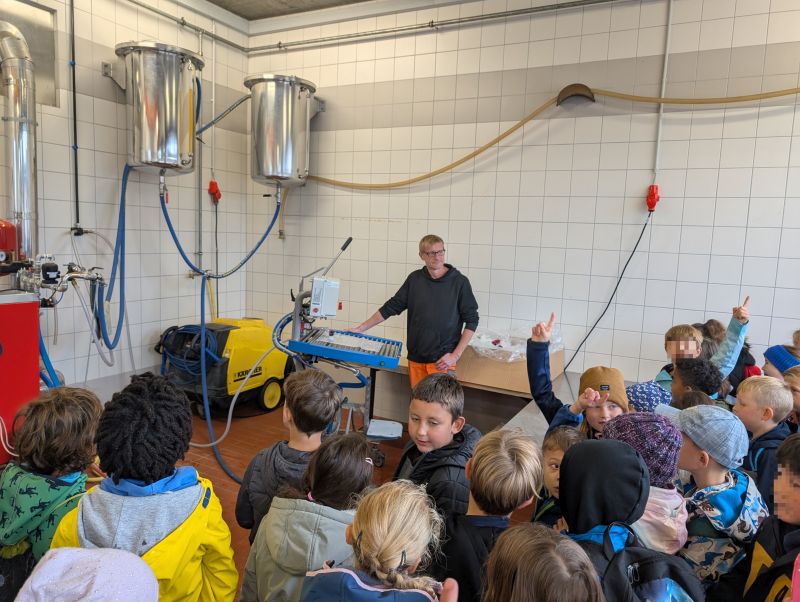 Im nächsten Schritt wurde ein Schlauch an die Kiste mit Apfelsaft angeschlossen, und der Saft floss in eine weitere Maschine, wo er erhitzt wurde. Dieser Prozess ist wichtig, um die Haltbarkeit des Safts zu verlängern und Bakterien abzutöten. Natürlich durften die interessierten Grundschulkinder den frischen Apfelsaft kosten, und er schmeckte fantastisch!