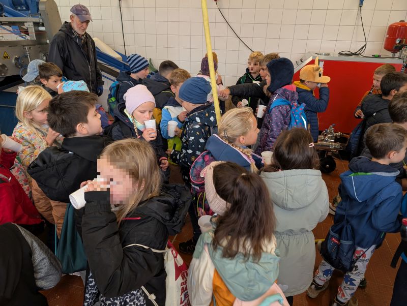 Am 26.09.25 unternahmen die Klassen 2a und 2b einen unterhaltsamen Ausflug. Von der Henri-Arnaud-Grundschule aus ging es zur nahegelegenen Kelter, wo die Klassen von sechs engagierte Mitarbeiter des Bauhofs und des Obst- und Gartenbauvereins erwartet wurden. Sie zeigten den Zweitklässlern mit großer Begeisterung, wie man Apfelsaft presst.