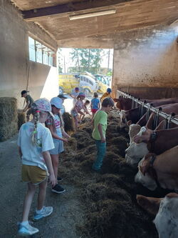 Wir – die Klasse 1b – wanderten letzte Woche zum Bauernhof der Familie Jaggy nach Erlenbach. Dort angekommen legten wir zuerst eine Vesper- und Spielpause ein. Dann konnten wir die Kuhställe anschauen. Wir konnten sehen, wie die Kühe leben, was sie fressen und wie sie gefüttert werden. Danach durften wir die Kälbchen besuchen und uns ansehen, wie die Kühe mit dem Melkautomat gemolken werden. Zum Schluss bekamen wir noch Wassermelonenstücke spendiert. Auf dem Rückweg machten wir noch einen Stopp beim Spielplatz.