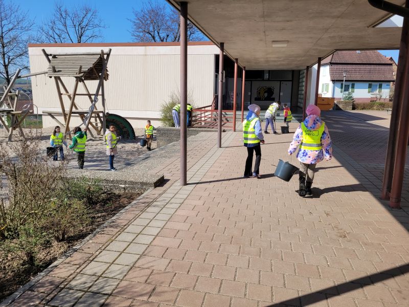 Am Freitag, 20.03.26 hieß es – raus aus dem Schulhaus und ab auf die Suche nach den Müllsündern. Auf Initiative des Elternbeirates hatte die Firma Pre Zero die notwendigen Utensilien gespendet. So durchkämmten die Schulkinder ausgestattet mit Warnwesten, Greifzangen und Eimern das Gebiet rund um die Schule. Zuerst war der Schulhof dran, entsetzt von der Menge Müll, die gefunden wurde, erweiterte die 2a voller Tatendrang den Radius bis zum Spielplatz. Das Ergebnis war beeindruckend. Gefüllt mit vielen Zigaretten, Taschentüchern, Plastik, Dosen und sogar einem Handschuh, standen am Ende 13 volle Eimer im Schulhof. Jetzt wurde noch sortiert und dann in den richtigen Containern verteilt. Solche Müllsammelaktionen sind ein wichtiger Schritt hin zu einer sauberen und gesünderen Umwelt. Außerdem machen sie auch jede Menge Spaß. Daher wird ab jetzt jeden Monat eine andere Klasse die Aktion übernehmen. Vielen Dank an die Firma Pre Zero für die großzügige Spende, mit der die Kinder sicher ihren Beitrag für mehr Sauberkeit in Ötisheim und eine bessere Umwelt leisten können.