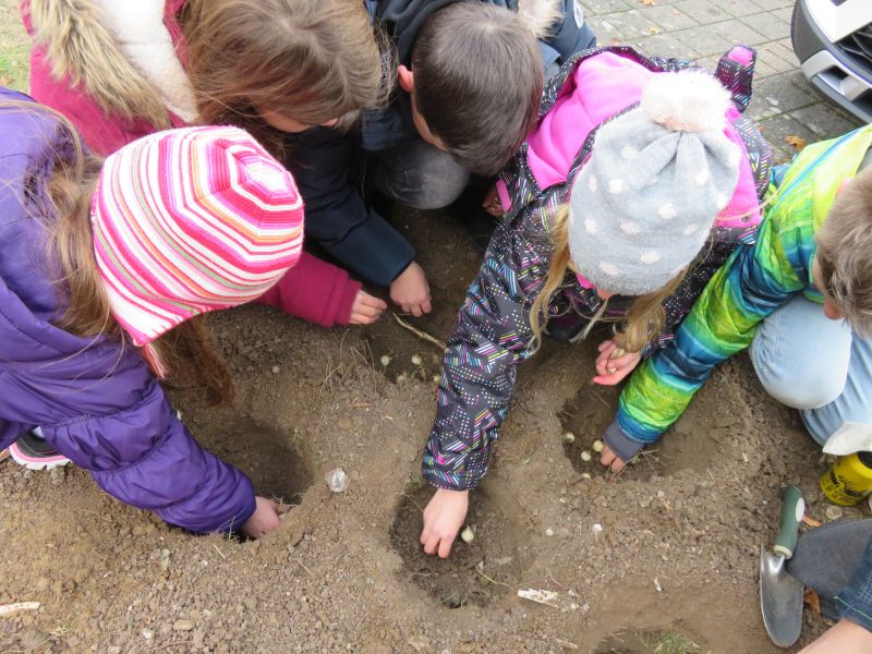 Am 19.11.2018 pflanzten wir, die Klasse 4a, Blumenzwiebeln vor unserer Henri-Arnaud-Grundschule ein. Dabei halfen uns zwei Gemeindemitarbeiter. Unsere Lehrerin Frau Hubert hatte Tulpen-, Krokusse-, Narzissen- und Traubenhyazinthenzwiebeln mitgebracht.