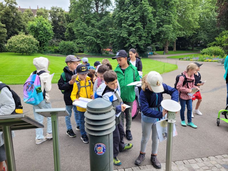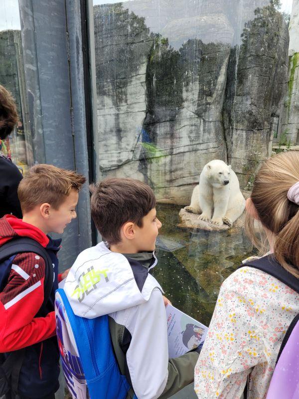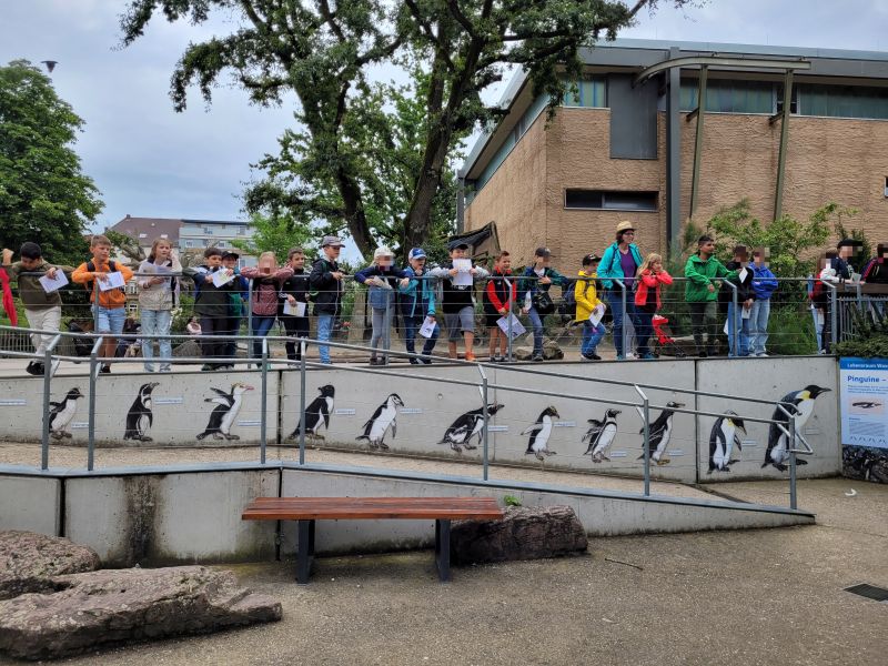 Am 04.07.24 trafen sich die Kinder der Klasse 2a im Schulhof. Nach einer kleinen Wanderung zum Bahnhof und einer erlebnisreichen Zugfahrt nach Karlsruhe war das Ziel der Zoologische Stadtgarten. Zuerst wurde sich gestärkt, Reisen ist anstrengend, aber bald danach liefen die Kinder zur ersten Bewegungsstempelstation – wie lange kann ein Flamingo auf einem Bein stehen? Das musste natürlich auch ausprobiert werden. Weiter ging es zu den Gehegen, da wurde gestaunt, sich an den Tierkarten informiert und beobachtet. Ein Höhepunkt war die Fütterung der Pinguine und der Seehunde, die die Kinder hautnah miterleben konnten. Wie geschickt und elegant diese Tiere durchs Wasser gleiten, während sie Tricks und Kunststücke vorführen um sich ihre begehrten Fischhappen zu verdienen. Spätestens als die Seelöwendame sogar einen Handstand zeigte, waren alle begeistert. Bei den Giraffen, Elefanten, Schimpansen und Raubtieren vorbei ging es zum Exotenhaus. Wie im Dschungel war das Klima und in einer Höhle schwirrten Fledermäuse um die Köpfe der Zweitklässler. Da gehörte schon Mut dazu, in diese dunkle Höhle zu gehen. Nachdem im ersten Schuljahr bereits ein Besuch bei den Tieren auf dem Bauernhof stattgefunden hatte, gerade jetzt am E-bookcreator die Haustiere im Sachunterricht erforscht werden, waren die Zootiere ein willkommener Abschluss der Einheit Tiere. Müde, aber voller neuer Eindrücke und Erfahrungen kamen alle am Nachmittag dank der Unterstützung von Frau Münchinger und Frau Scheipner wieder wohlbehalten in Ötisheim an. Dieser ganz besondere Schultag ging viel zu schnell zu Ende.