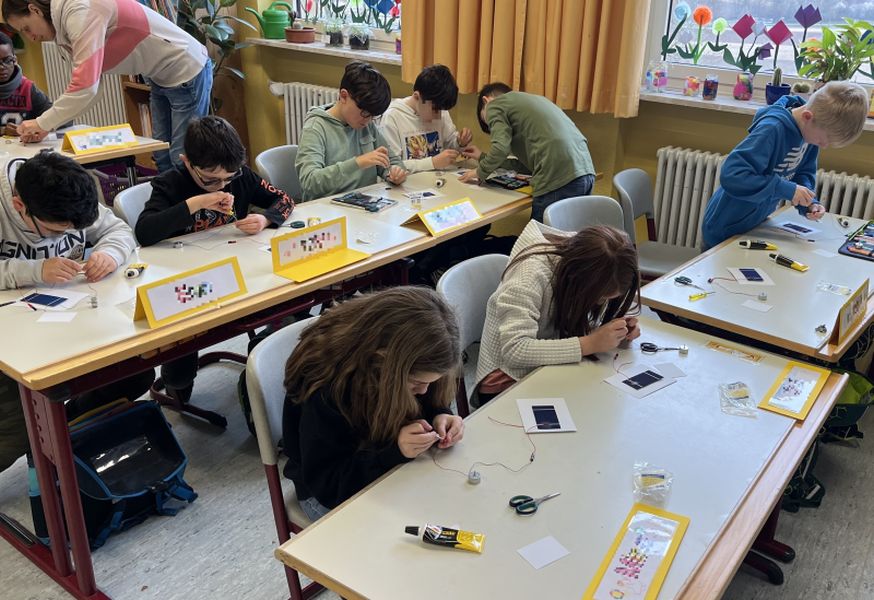 Besonders viel Spaß hatten wir beim Bauen einer eigenen Photovoltaikanlage. Mithilfe einiger Kabel und Stecker haben wir eine Solarzelle mit dem Motor verbunden. Daran befestigt war ein Propeller, der sich beim Lichteinfall auf die Zelle drehen konnte. Am Ende des Tages durfte jedes Kind eine funktionierende Photovoltaikanlage mit nach Hause nehmen.