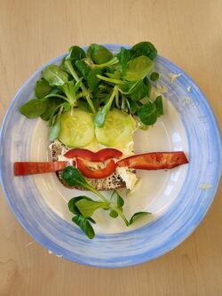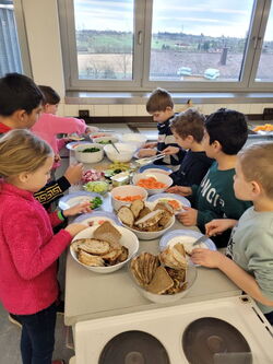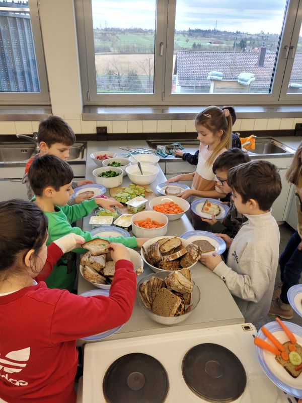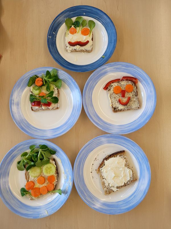Zum Glück konnten alle Wünsche erfüllt werden. Mit Gurken, Karotten, Radieschen, Salat und Frischkäse zog die Klasse bepackt wieder zurück in die Schule. Daraufhin wurde geschält und geschnippelt. Am Büffet durfte sich dann jeder sein eigenes lustiges Brotgesicht herstellen. Mit viel Appetit wurde das gesunde Brot verzehrt – selbst gemacht schmeckt es doch einfach am besten. Zum Schluss halfen viele fleißige Hände beim Abwaschen und Abtrocknen.