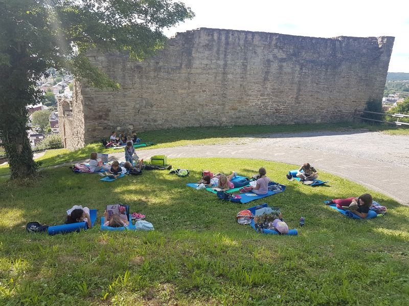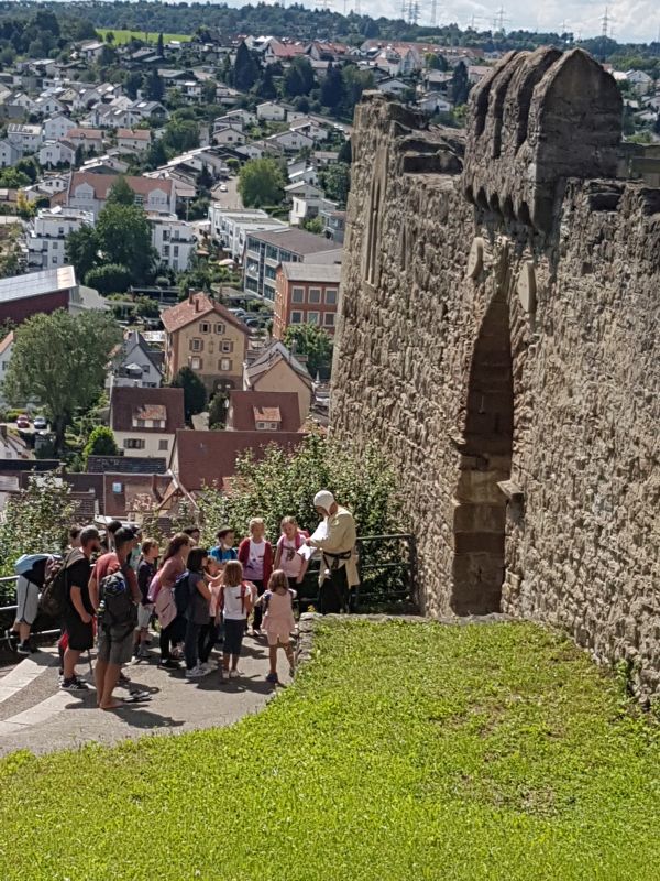 Los ging es mit dem Linienbus nach Mühlacker und einem Spaziergang hinauf auf die Burg Löffelstelz, bei dem doch einige ganz schön ins Schwitzen kamen. An der Burg angekommen, wartete schon Ritter Wallinger – ein Stadtführer von Mühlacker - auf die Kinder. Nacheinander zeigte er den Klassen die Burg und erzählte interessante Geschichten. Vor allem der Sendergeist im Burgverlies beeindruckte die Kinder. Neben der Burgführung wurde natürlich gelesen. Gemütlich liegend auf der Burgwiese genossen alle ihre mitgebrachten Bücher und den Ausblick über Mühlacker. Nach so viel Denkarbeit durfte die Bewegung natürlich nicht fehlen, mit dem Besuch auf dem angrenzenden Spielplatz gab es noch genug Zeit zum Austoben. Mit großem Bedauern wurden die Eltern in Empfang genommen, die natürlich viel zu früh ihre Kinder abholen kamen. Rundum ein gelungener Nachmittag, der unter anderem durch das Engagement von Herrn Wallinger und die gute elterliche Unterstützung von Herrn Vukelic und Herrn Weber stattfinden konnte.