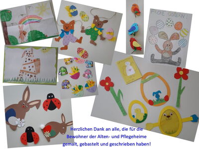Ende März erreicht uns die Idee von Bürgermeister Henle, für die Senioren in den Alten- und Pflegeheimen etwas zu basteln, zu malen oder zu schreiben. Die Idee gaben wir gerne an die KInder in der Notbetreuung der Schule und die KInder, die gerade zu Hause lernen, weiter. Viele gemalte Bilder, Briefe und Bastelarbeiten erreichten uns. Sie wurden an das Rathaus weitergeleitet und von dort aus gingen sie in die Alten- und Pflegeheime. Wir freuen uns sehr, dass wir den älteren Menschen dort mit den bunten Basteleien und einigen aufmunternden Worten vielleicht ein bisschen Freude machen konnte in dieser schwierigen Zeit, in der sie keinen Besuch bekommen dürfen. Herzlichen Dank an alle, die sich an der Aktion beteiligt haben.