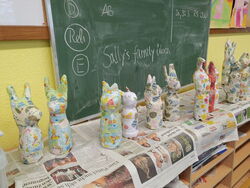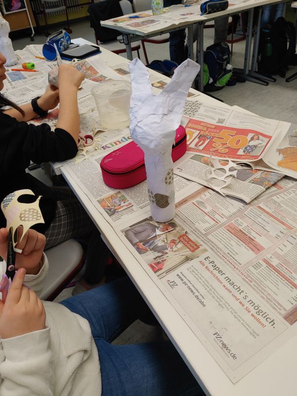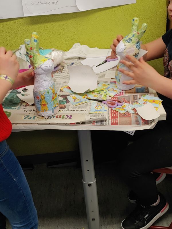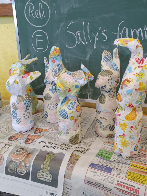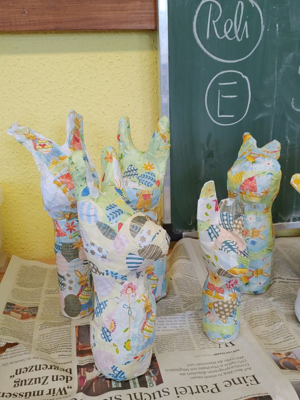 Aus sandgefüllten Kunststoffflaschen hat die Klasse 3b mit Hilfe von Zeitungspapier, sehr viel Kreppband, Kleister, weißem Papier und Geschenkpapier diese fantasievollen Osterhasen gefertigt.