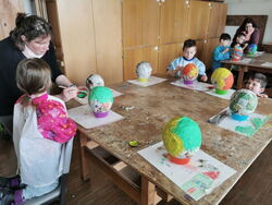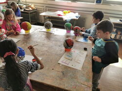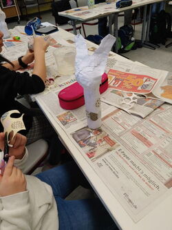 Die 1a hat auch gekleistert, allerdings entstanden hier Ostereier. Luftballons wurden mit Zeitungspapier und Kleister beklebt und später bunt angemalt. Im aufgeschnittenen Ei konnten die Kinder die gefundenen Ostereier verstauen.