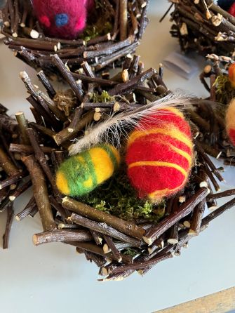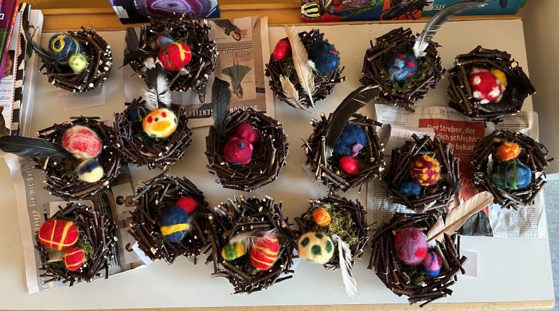 Für Ostern fertigte die Klasse 2b hübsche kleine Osternestchen an. Dazu vermischten die Kinder in kleine Stücke geschnittene Zweige mit Holzleim und formten damit in einer Schüssel ein Nestchen. Bunte Ostereier wurden mit der Nadel gefilzt. Die kleinen Nestchen wurden noch mit etwas Moos gefüllt und mit Hühnerfedern dekoriert.