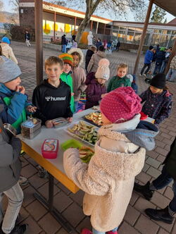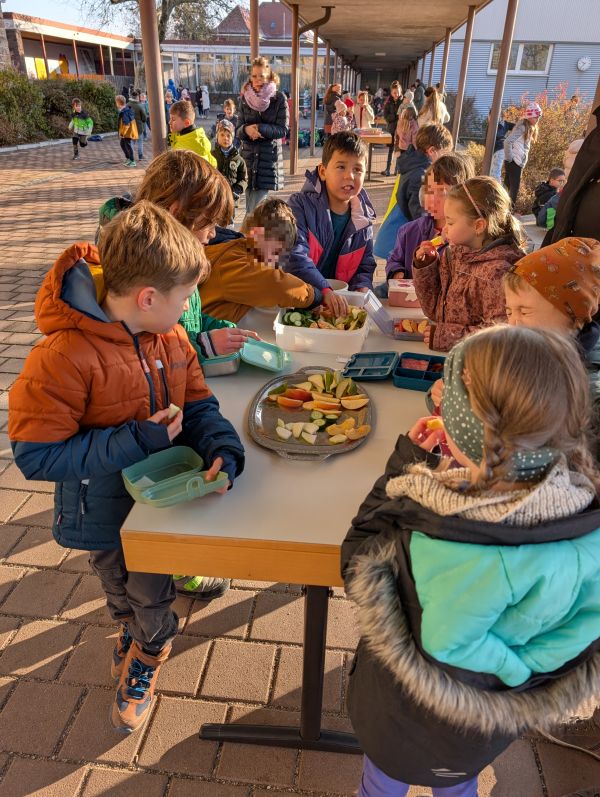 Die Obst- und Gemüsepause ist inzwischen ein fester Bestandteil im Schulkalender und wird zweimal jährlich vom Elternbeitrat organisiert und finanziert. Der Elternbeitrat bedankt sich herzlich bei den Helferinnen, unserem Hausmeister Herr Grund und unserer Direktorin Frau Sartorius für die Unterstützung.
