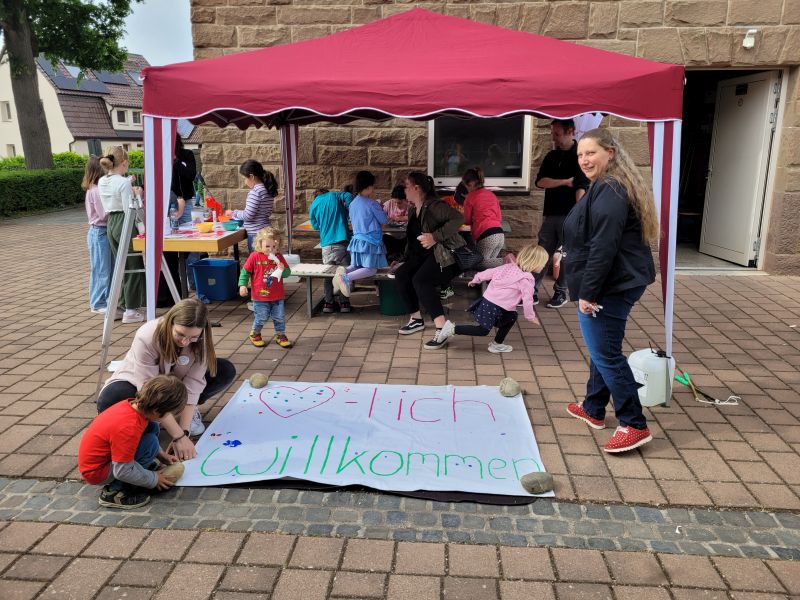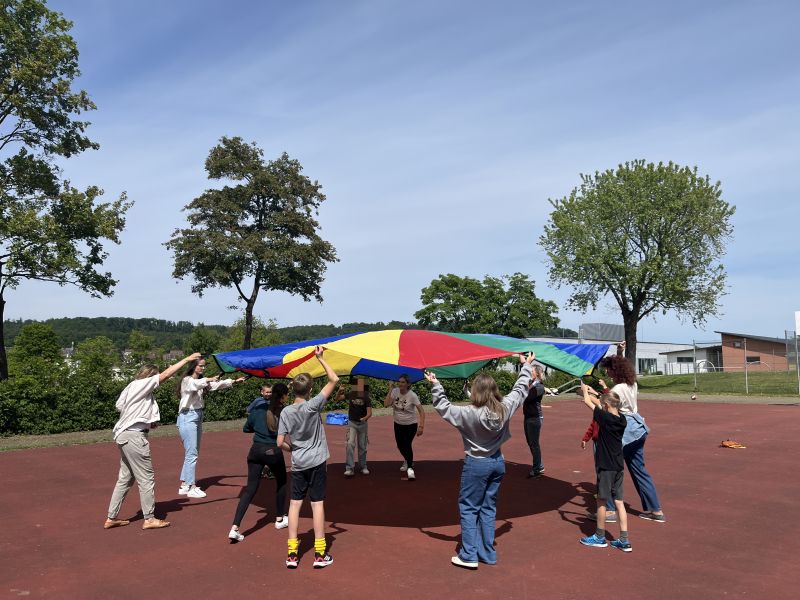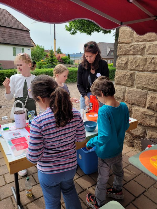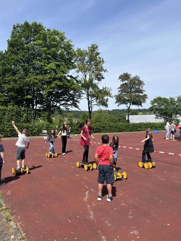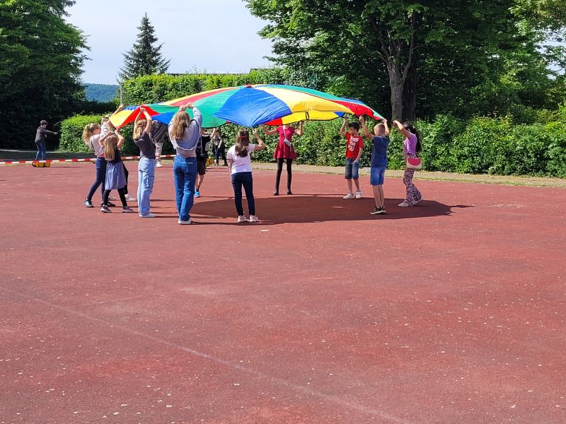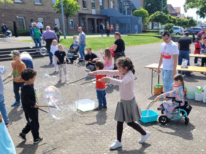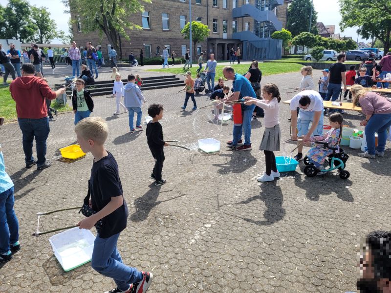 Auf dem Schulhof konnten sich im Anschluss an das Programm die Gäste mit den Schulsozialarbeiterinnen der beiden Schulen und der Offenen Jugendarbeit unterhalten. Außerdem gab es ein Glücksrad und eine Spielstraße auf dem roten Platz. Besonders begeistert waren die Kinder von der Aktion „Riesenseifenblasen“ des Elternbeirates.